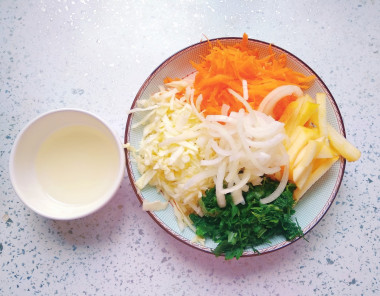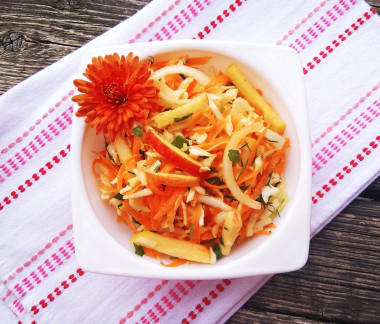 Сегодня неожиданно приехали гости и надо было срочно придумать, что подать на стол. Первым делом приготовила салат, он успел настояться к приходу гостей и стал очень сочным. Капуста попалась не сильно плотная, а помяв ее с солью, выделилось много сока. Морковь потерла на крупной терке. Яблоко взяла кисло-сладкое, нарезала его соломкой. Лук у меня обычный и чтобы смягчить вкус, я его обдала кипятком. Из зелени взяла укроп и петрушку. Салат простой, но очень сочный и вкусный, к тому же отлично подошел к мясу. Добавление яблока придало салату дополнительную свежесть и необычный привкус. Лимонный сок тоже хорошо дополняет овощи. Прекрасный рецепт витаминного салатика. Спасибо!