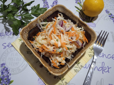 Приготовила простой и вкусный салат из свежей белокочанной капусты на ужин по этому рецепту. Это прекрасное блюдо. Имея всё в наличии, я без труда сделала лёгкий салат. Времени потратила совсем немного. Капусту свежую тонко нашинковала с помощью овощечистки. Морковку крупно потёрла, яблоко нарезала кубиками, измельчила свежую зелень петрушки. От себя ещё добавила фиолетовый лук, нарезанный тонкими полукольцами. Заправила салат лимонным соком, постным маслом без запаха, солью и сахаром. Очень вкусно получилось. Все продукты отлично сочетаются между собой. Капуста в салате прекрасно похрустывает. Яблочко придаёт изюминки простому салату. А заправка просто великолепна. Лимонный сок даёт салату недостающей кислинки. Это очень вкусно! Салат быстрый и простой в приготовлении из доступных ингредиентов. Вкус волшебный, сложно оторваться. Всем рекомендую этот замечательный салат. Большое спасибо автору!