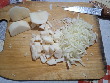 Очищенную луковицу нарежьте тонкими полукольцами.