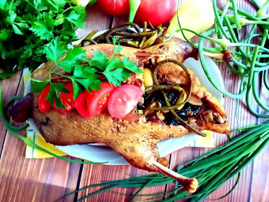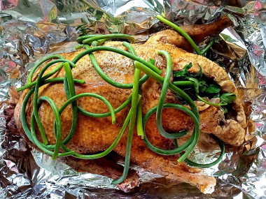 У меня был домашний не очень молодой селезень весом три с лишним килограмма. Мариновала я его почти двое суток в пакете, периодически переворачивая. Главное хорошо смазать маринадом внутри тушки. Перед запеканием вложила вовнутрь пять мелких луковиц, разрезанных пополам. Следом вложила пучок петрушки и укропа. Сверху выложила мои любимые чесночные стрелки).