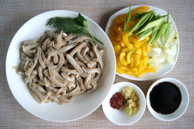 ), давленный чеснок 2 зубчика, мелко рубленный имбирь (размером не больше 2х2х0,5 см), и пока смесь настаивалась нарезала на полосочки рубец. Смешала его с приготовленным соусом и дала постоять минут 5.