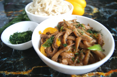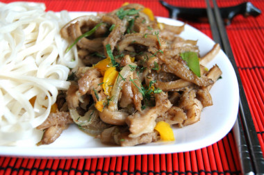 Можно кушать как самостоятельное блюдо, так и подать к нему гарнир, например рис или лапшу, как в моем примере.