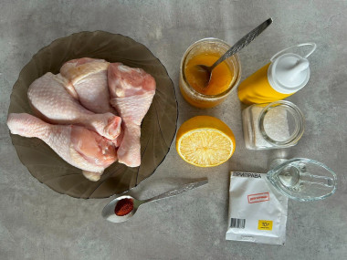 Калорийность продуктов: Куриные ножки, Лимоны, Мёд, Растительное масло, Горчица готовая, Паприка, Соль