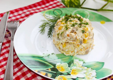 Вариант салата для любителей здоровой, вкусной пищи! Закусочный салат с кукурузой грибами и курицей с поджаркой из шампиньонов моркови и лука с хорошим сочетанием ингредиентов, очень сочный и насыщенный. Выглядит аппетитно, особенно при красивом ресторанном оформлении. Спасибо за рецепт!