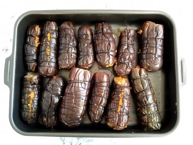 Нафаршируйте баклажаны начинкой и обмотайте их нитками так, чтобы они при дальнейшей обработке не развалились, и начинка из них не выпала.