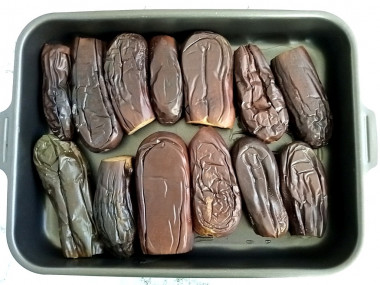 Остывшие и слегка сплюснутые баклажаны извлеките из-под пресса. Каждый баклажан разрежьте пополам вдоль плода, не доходя до конца (как на фото).