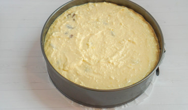 Для запекания подойдет любая жаропрочная форма. Я использую разъемную металлическую (20-24 См). Смажьте дно и бока формы небольшим количеством растительного масла или застелите форму кулинарной бумагой. Переложите в неё все творожное тесто. Поставьте форму в духовку, предварительно разогретую до 180 градусов на 40-50 минут. Ориентируйтесь по своей духовке.