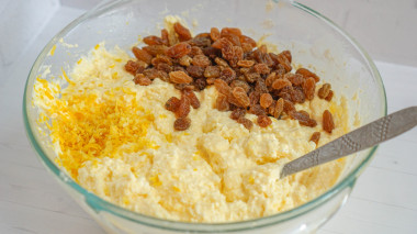 Затем вмешайте мягкий творог, сметану, муку и разрыхлитель. Лимон помойте и снимите с него цедру. Добавьте в тесто подготовленный изюм и цедру лимона. Все ингредиенты перемешайте друг с другом и доведите массу до однородности просто перемешивая все венчиком.