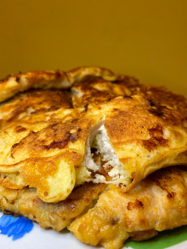 Сверху налейте немного кляра, чтобы он полностью покрыл сыр. Затем аккуратно лопаткой переверните каждую отбивную и жарьте на другом боку еще 3-5 минут до появления золотистой корочки и до полной готовности курицы.