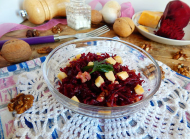 Ой, мой любимый салатик: свекла+сыр+чеснок!!!Да еще и орешки! Салат Сыр под шубой я сделала без слоёв, не люблю слоеные салаты, сыр нравится кусочками. Обожаю такое сочетание продуктов! Спасибо