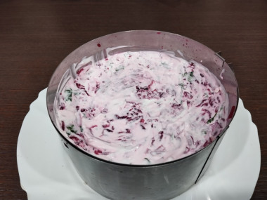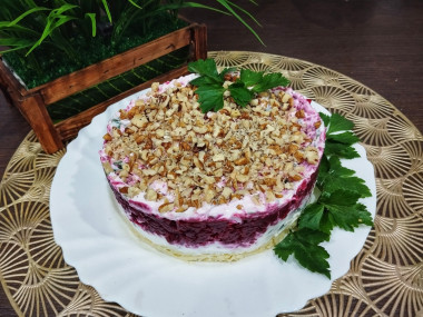 Выложила слоями сыр- соус сметанный-свекла-соус- орехи. Убрала в холодильник на 30 минут.
