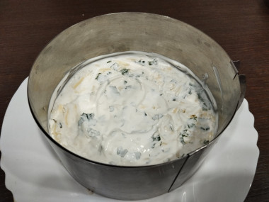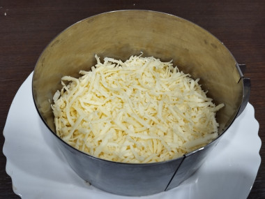 Можно приступать к сборке салата. На дно разъемной формы выложите сыр.