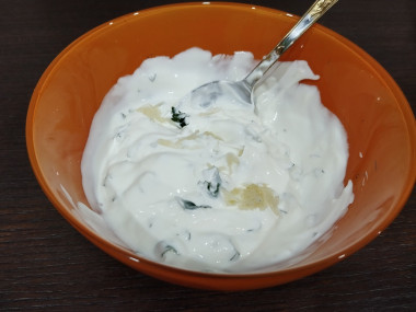 В сметану добавила измельчённый чеснок, чуть-чуть соли, измельчённую зелень и перемешала.