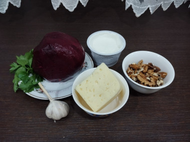 Свеклу натерла на крупной тёрке, слегка отжала сок. Сыр у меня был Российский,который также натерла на крупной тёрке. Орехи мелко порубила.