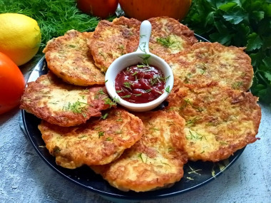 Я никогда не пробовала добавлять в овощные оладьи баклажаны. Но увидела на сайте рецепт оладьев из баклажанов и решила попробовать. Цукини у меня были зрелые, поэтому сняла с них шкурку и вырезала семена. Натерла его на средней тёрке, посолила, а затем отжала сок. Свежего баклажана у меня не нашлось, но были замороженные. На тёрке их не натрешь, поэтому мелко нарезала и отжала воду, оставшуюся после разморозки. Фету заменила сливочным сыром, он тоже нежный и солоноватый. Тесто получилось густым. Выкладывала его на разогретую сковороду с растительным маслом и формировала ложкой круглые оладьи. Они отлично пожарились даже на обычной сковороде. Получились оладьи из баклажанов вкусными, пряными, сытными. Баклажаны как и цукини в готовом блюде почти не чувствуются, поэтому детям тоже понравилось)