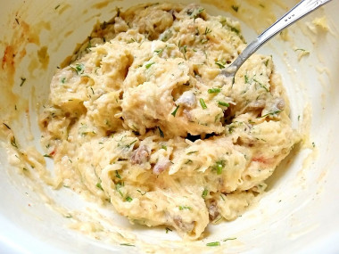 Добавьте сыр и нарезанные зелень, лук и чеснок. Тщательно перемешайте. Тесто должно получиться густое.