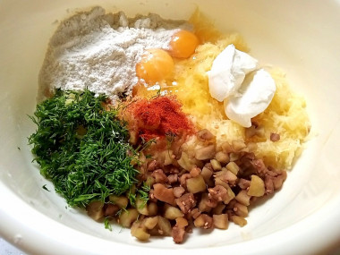 Натертые баклажан и кабачок отожмите от лишней влаги и отправьте к яйцам и муке. Тщательно перемешайте.