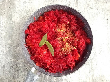Сначала обжарила лук и убрала его со сковороды. Морковь не размораживая выложила на сковороду. Лед быстро растаял и морковка хорошо обжарилась. Все соединила и выложила в сковороду свеклу, помидоры, перец и томат. Тушила минут 20. Добавила овощную приправу, лавровый лист, подсолила и тушила еще 20 минут. От себя добавила чайную ложку лимонного сока для более пикантного вкуса. В процессе приготовления подливала немного воды.