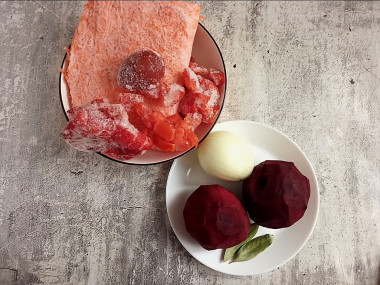 Свекла у меня была свежая. А морковку взяла из заморозки. Также обнаружила в морозилке болгарский перец и помидоры. Помидоров было не очень много, поэтому добавила томатную пасту.
