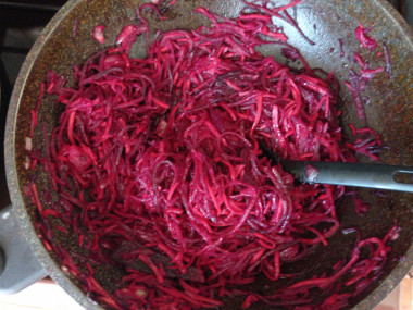 Итак, начнем. Все очень просто. Мелко рубим лук, обжариваем его на сковороде, пока он не станет золотистым. Пока лук жарится, натираем на средней терке морковь и свеклу. Замечу, что свеклу легче будет тереть, если вы ее заранее сварите или запечете в духовке (так она сохранит больше полезных веществ). Если же нет времени варить или запекать свеклу, ну например, гости нагрянули, трем ее сырой.