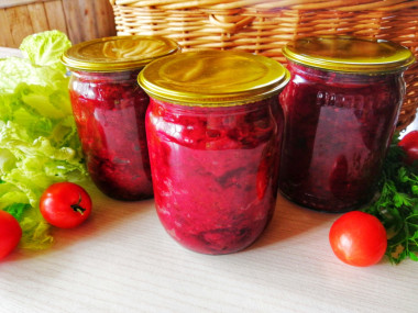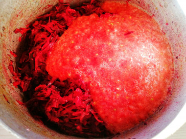 Прекрасная заправка👍 Соль, сахар, уксус, всё гармонирует, вообще ничего не изменяла. Свеклу и морковь пропустила через комбайн; помидоры нарезала, измельчила до пюре погружным блендером, затем пролила через сито, не осталось ни косточек, ни шкурок. Боялась, что из-за долгого тушения (у меня по времени вышло дольше, т.к. на малыша отвлеклась), цвет побледнеет, но нет, очень красивый и яркий цвет получился. У меня вышло 7 баночек по 0.5 и остаток в тарелочке, остыл остаток и вполне себе хороший салат под вареную картошечку😊