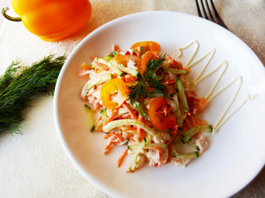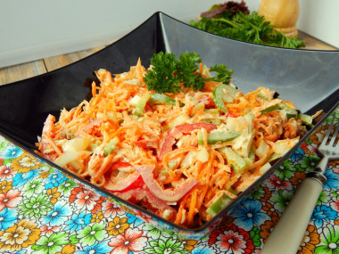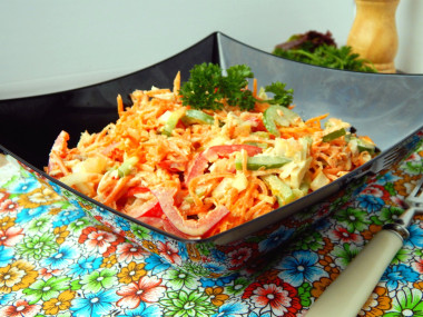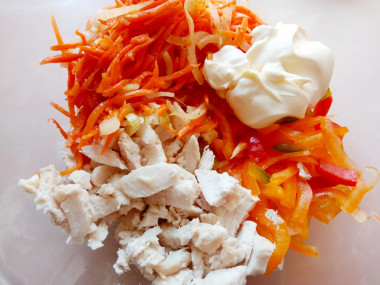 Быстрый в приготовлении, вкусный и питательный салат. Легкий салат курица корейская морковь перец готовится очень быстро. Морковь придает этому салату пикантности, а перец – легкую свежесть. Спасибо!