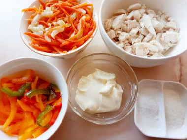 Как сделать салат из курицы, корейской моркови и перца? Подготовьте ингредиенты.