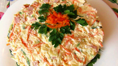 Должно быть вкусно! Я на сайте увидела новый слоеный салатик с курицей, корейской морковкой, шампиньонами и под сыром.