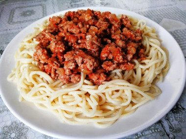 Для измельчения свежего томата понадобится обычная терка или блендер. Можно добавлять томатную пасту, либо кетчуп. Отварные спагетти соединяются с зажаркой из фарша и помидора. Фарш можно брать любой мясной или из курицы.