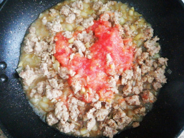 7.Томатное пюре с чесноком добавить к фаршу. Перемешать, жарить под крышкой около 7 минут. Затем прожарить на среднем огне без крышки 3 минуты, чтобы испарилась влага.