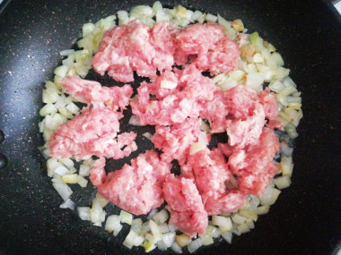 5.Затем добавить к полусырому луку мясной фарш, насыпать черный перец и соль по вкусу. Жарить под закрытой крышкой около 5-7 минут.