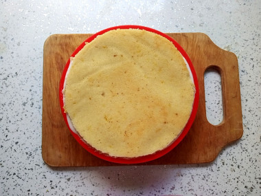 Возьмите готовый бисквитный корж (его можно купить или испечь заранее самостоятельно). С помощью кулинарного кольца вырежьте из него круг нужного вам диаметра. Размер круга зависит от используемой вами формы. Для этого торта использование коржей не обязательно, но с ним, на мой взгляд, будет вкуснее.