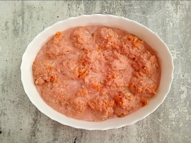 приготовьте соус. Для этого в глубокой емкости смешайте сметану с томатным соусом. Добавьте воду, щепотку соли и перемешайте до однородности.