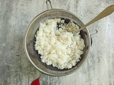 Для варки риса используйте кастрюлю. Несколько раз промойте рис, залейте водой из расчета, что на один стакан риса надо брать 1,5 стакана воды. Варите сначала на сильном огне доведя до кипения, затем проварите в течение 5 минут. Рис должен свариться до полуготовности, до готовности он дойдет, когда будет запекаться в голубцах. Промойте его холодной водой, оставьте в дуршлаге, чтобы стекла вода и полностью остудите.