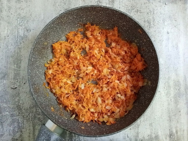 Нагрейте сковороду, аккуратно, чтобы не обжечься, вылейте на нее растительное масло. Масло должно быть с высокой температурой дымления, например, рафинированные сорта подсолнечного, оливкового и виноградного. Так как морковь готовится дольше лука, жарьте сначала натертую морковь. Жарьте на среднем огне, периодически помешивая, около 3 минут.