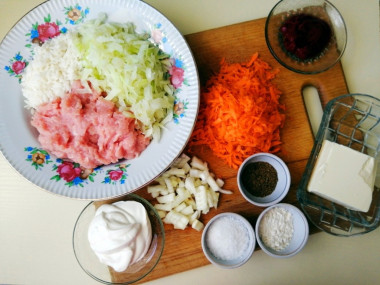 Как запечь ленивые голубцы в духовке? Подготовьте все необходимые ингредиенты. Капусты возьмите 350-400 грамм, так как срежутся неподходящие части (вялые и твердые листья, кочерыжка) и общий вес станет меньше. Фарш берите из любого мяса, которое вам нравится. Если покупаете готовый, берите качественный без добавок. Но лучше сделать фарш самому. У меня свинина и курица. Масло достаньте из холодильника, чтобы оно стало мягче.