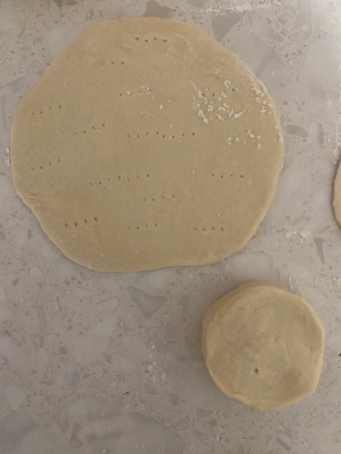 Каждый кусочек обомните и приплюсните ладонью. С помощью скалки раскатайте в лепешку толщиной 4-5 мм. Толщина может быть разной, но не более 1 см.
