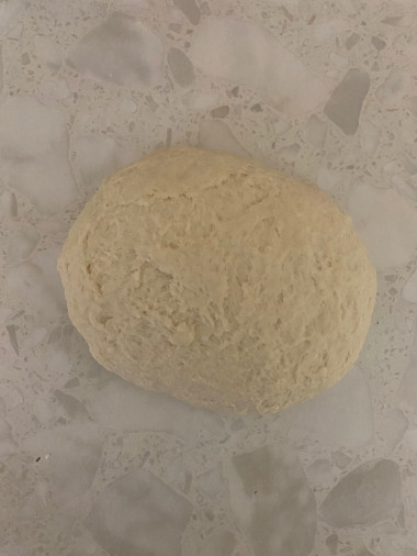 Теперь тесто замесите руками. Оно получается крутым и в то же время мягким. Сделайте из теста колбаску, разделите на 5-6 частей.