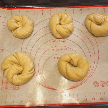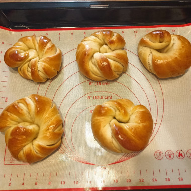 Противень смажьте растительным маслом или застелите силиконизированным пергаментом, чтобы булочки не прилипли. Выложите витушки на расстоянии друг от друга, потому как они увеличатся в размере. Поставьте булочки в теплое место на 20 минут, чтобы они стали более пышными. Смажьте поднявшиеся булочки взбитым яйцом и поставьте в разогретую духовку примерно на 25 минут. Время и температура выпечки у вас может отличаться, это зависит от вашей духовки.