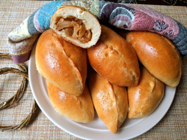 Готовые, румяные пирожки как пух на сухих дрожжах достаньте из печи и дайте им немного остыть. Подавайте их к столу с горячим ароматным чаем. Приятного аппетита!