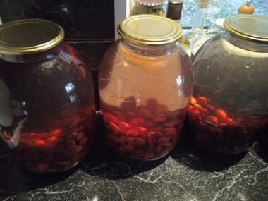 Заготовила компот из кизила на зиму по этому рецепту. Делала в трёх литровых банках. Собрала свежий кизил прям с дерева, кизиловое дерево хорошо уродило. Сложила ягодки на 1/3 в чистые банки и залила кипятком. После добавила весь сахарный песок, слив воду, и закипятила. Третий раз решила не заливать. Залив кипящий сироп, закатала банки с компотом. Сироп вышел в меру сладкий. Да, сначала вода в банках была прозрачная. За ночь компот настоялся и уже дал красивый рубиновый цвет.