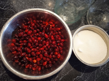 Подготовьте все необходимые ингредиенты. Выбирайте спелые, но упругие ягоды насыщенного красного цвета. Они не должны быть мятыми или с темными пятнами. Идеально подойдет свежесобранный кизил.