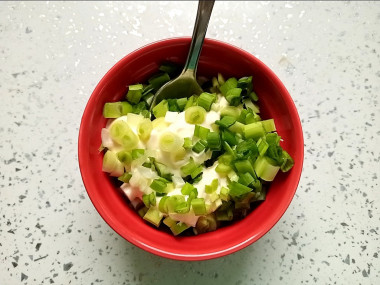 В отдельную емкость выложите майонез. Если по какой-то причине майонез использовать вы не хотите, замените его сметаной. Смешайте с рубленой зеленью.