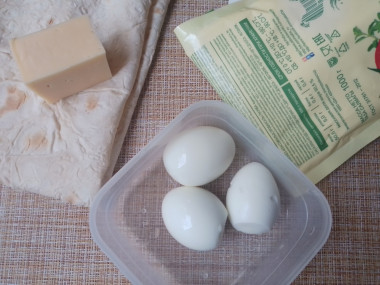 У меня был довольно большой лист лаваша, поэтому увеличила количество яиц. Предварительно их отварила до готовности и охладила в холодной воде. Сыр выбрала вкусный - это важно. Яйца и сыр натерла на крупной тёрке.