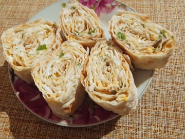 Для соуса смешала майонез с нарезанным зеленым луком. Лучок придает некую пикантность этому нежному рулету. Не советую заменять майонез сметаной, лаваш может размокнуть от нее. Я иногда смазываю лаваш плавленным сыром.