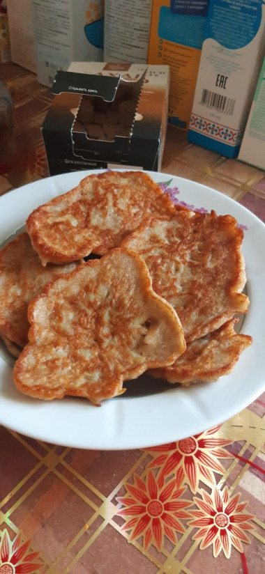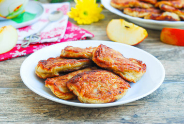 Мне очень понравился данный рецепт. Яблоки на терке делал, кожицу не срезал, она при разрезании яблока на 4 части и очистки серединки, при натирание кожица остается в руках. Вкус замечательный, жарится очень быстро. Ел со сметаной и айвовое варенье (мягкая айва).