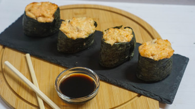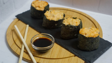 Готовое блюдо подаю к столу с соевым соусом и маринованным имбирем. Суши гунканы получились действительно, как в ресторанах японской еды! Такие вкусные, аппетитные и румяные! Спасибо автору за рецепт, буду готовить еще)