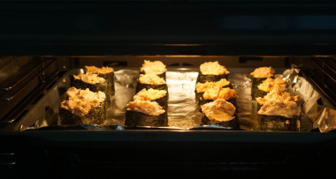 Поставьте гунканы в духовой шкаф на режим «гриль» и готовьте примерно 4 минуты. Если «гриля» нет, включите верхний нагрев при 200–230°C. В итоге у гунканов получится очень красивый румяный верх.