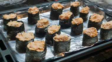 Самое интересное в приготовлении - это правильно завернуть гунканы, чтобы нори не разворачивались. Нижняя часть гункана - это отварной сформированный рис, верхний слой - это курица с соусом. Суши выкладываю на противень с фольгой и ставлю в духовку на режим "гриль" до румяной корочки.