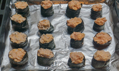 В каждый гункан выложите начинку. Противень застелите фольгой, на которую выложите гунканы.